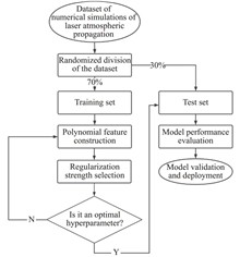 ObjectiveLaser atmospheric propagation is influenced by combined effects including turbulence, thermal blooming, atmospheric inhomogeneity, and other perturbations. Key beam quality metrics—such as target spot expansion ratio, spot radius growth, centroid displacement, and encircled energy ratio—quantify beam distortion and attenuation during atmospheric propagation, enabling systematic evaluation of laser propagation performance. Existing models fall into three categories: wave-optics models, empirical scaling-law models, and statistical analysis models. Wave-optics models provide high precision but suffer from prohibitive computational complexity for real-time applications. Empirical models simplify calculations but fail under extreme conditions (e.g., strong turbulence or thermal blooming). Statistical models enable rapid predictions but produce ensemble-averaged results insensitive to transient/local variations, require stringent data quality, and lack interpretability. This study introduces a Lasso regression-based framework to address these limitations, achieving real-time capability, high accuracy, and interpretability for laser atmospheric propagation assessment.MethodsFigure 1 outlines the Lasso regression modeling workflow (Fig.1). Simulation data were generated using a four-dimensional high-energy laser atmospheric propagation and adaptive optics compensation code developed by the Anhui Institute of Optics and Fine Mechanics, Chinese Academy of Sciences (Tab.1). The code implements a multi-phase-screen propagation model, with datasets comprising laser parameters (wavelength, power), atmospheric parameters (turbulence strength, thermal blooming distortion), and beam quality metrics. Lasso regression with L1 regularization was applied to model beam quality degradation mechanisms, automatically selecting dominant features from high-dimensional data while suppressing noise. Hyperparameters (regularization strength, convergence tolerance) were optimized via grid search (Fig.2, Tab.2).Results and DiscussionsThe Lasso regression-based model resolves critical limitations of conventional methods in real-time performance, accuracy, and feature interpretability (Tab.3). Leveraging Lasso’s feature selection mechanism, the model achieves precise predictions of beam quality metrics while maintaining computational efficiency and interpretability. Compared to traditional statistical models, it delivers superior prediction accuracy and faster computation, fulfilling real-time evaluation requirements in practical engineering scenarios. Simulation analyses demonstrate robust performance under complex atmospheric conditions, including strong turbulence and thermal blooming (Fig.3-Fig.7).ConclusionsThe proposed Lasso regression model enables rapid, accurate evaluation of laser atmospheric propagation under extreme conditions, addressing the trade-off between computational cost and physical fidelity. Its embedded feature selection mechanism aligns with laser propagation physics (e.g., turbulence-driven beam wander vs. thermal blooming-induced defocus), enhancing interpretability for field deployment. Future efforts will extend the framework to multi-wavelength/pulse regimes and hybrid machine learning architectures (e.g., physics-informed neural networks) for improved generalizability.