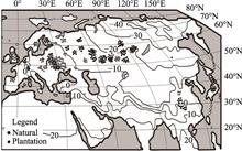 A comparative discussion of the advantages and disadvantages of natural stands and plantations, including in terms of their productivity and stability, began from the moment of the first forest plantings and continues to this day. In the context of the progressive replacement of natural forests by plantations due to deforestation, the question of how will change the carbon storage capacity of forest cover when replacing natural forests with artificial ones in a changing climate becomes extremely relevant. This article presents the first attempt to answer this question at the transcontinental level on a special case for two-needled pine trees (subgenus Pinus L.). The research was carried out using the database compiled by the authors on the single-tree biomass structure of forest-forming species of Eurasia, in particular, data of 1880 and 1967 of natural and plantation trees, respectively. Multi-factor regression models are calculated after combining the matrix of initial data on the structure of tree biomass with the mean January temperature and mean annual precipitation, and their adequacy indices allow us to consider them reproducible. It is found that the aboveground and stem biomass of equal-sized and equal-aged natural and plantation trees increases as the January temperature and precipitation rise. This pattern is only partially valid for the branches biomass, and it has a specific character for the foliage one. The biomass of all components of plantation trees is higher than that of natural trees, but the percent of this excess varies among different components and depends on the level of January temperatures, but does not depend at all on the level of annual precipitation. A number of uncertainties that arose during the modeling process, as well as the preliminary nature of the obtained regularities, are noted.