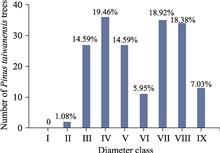 Pinus taiwanensis is a species endemic to China. This study selected four typical plots of Pinus taiwanensis in the natural secondary forest around Macheng City, in order to reveal the characteristics of and the relationships between different diameter classes (determined based on the diameter at breast height or DBH), forest densities and species diversity, as well as the similarities of species diversity of different plots within the community. The result showed that Pinus taiwanensis was the dominant species in the community. The ratio of Pinus taiwanensis trees of diameter class IV reached a peak of 19.46% of the total followed by diameter class VII at 18.92%. The study recorded 156 species of vascular plants from 130 genera of 71 families; Pinus taiwanensis was the dominant species in the community. When the forest density was 1200 trees ha -1 with the largest average diameter of DBH=36.779±4.444 cm, the diversity (Shannon index H'=1.6716) and the evenness (Pielou index E=0.6727) of the tree layer was the highest. When the forest density reached 1525 trees ha -1 with the lowest average diameter of DBH=18.957±5.141 cm, the richness (Dma=5.4308), the diversity (H'=2.9612) and the evenness (E=0.8985) of all shrub layers climbed to the maximum. When the forest density was 1325 trees ha -1, the richness (Dma=5.8132), the diversity (H'=3.0697) and the evenness (E=0.9025) of all herb layers peaked. In terms of vertical structure, the average diversity indexes were herb layer>shrub layer>tree layer. High canopy density weakened light intensity in the community, causing a reduction in the species diversities of herbs and shrubs. The average similarity coefficient between the sample plots was 0.3356, which was at the medium dissimilarity level. External disturbances and improper management were major contributors to the low species diversity of the community. The implementation of scientific management measures is urgently needed to optimize the forest structures of Pinus taiwanensis, create a benign community environment, and promote species diversities and establish a stable forest community structure.