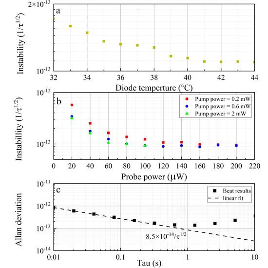 Fig. 4 (a) Short-term frequency stability variations corresponding to changes in reference cell temperature. (b) Impact of pump-probe power ratios on short-term frequency stability. (c) Optimal beat-note frequency stability and linear fitting results.