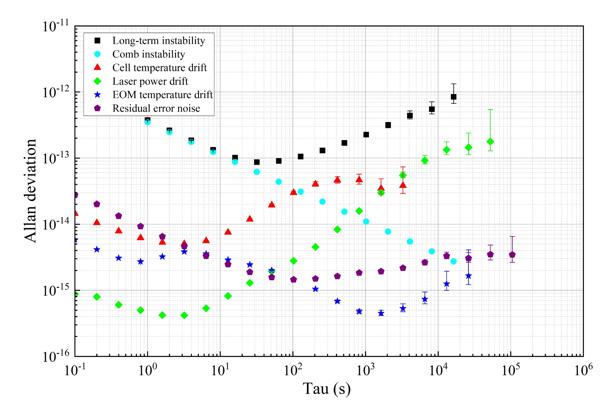 Fig. 5 Long-term frequency stability of the Voigt optical frequency standard compared with an optical frequency comb, along with contributions from various technical noise sources.