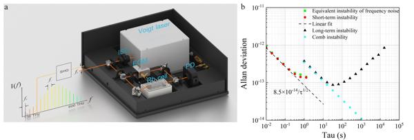 Fig. 1 (a) Experimental setup diagram of the Voigt optical frequency standard. (b) Frequency instability of the Voigt optical frequency standard.