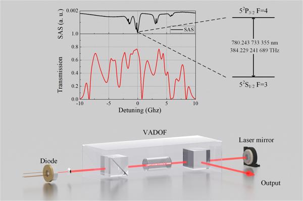 The key to the turnkey operation of the compact Voigt optical clock lies in the Voigt laser, which automatically aligns its frequency to atomic transition lines. As illustrated in Figure 2 (lower panel), the experimental setup of the Voigt laser is presented. To achieve precise alignment of the Voigt laser with atomic spectral lines, an in-depth investigation into the transmission characteristics of the Voigt atomic dispersive optical filter (VADOF) under intense light and magnetic fields was conducted. This ensured that the transmission spectrum peak of the optimized VADOF (Figure 2, upper panel) perfectly matched the target atomic transition line in the modulation transfer spectroscopy (MTS) locking scheme. Under these conditions, the output frequency of the Voigt laser remains confined within the Doppler-broadened linewidth of the rubidium atomic transition 52𝑆1/2, 𝐹 = 3 → 52𝑃3/2, 𝐹 = 4, unaffected by external parameters. This enables automatic frequency locking within 60 seconds upon startup, significantly simplifying operational procedures.