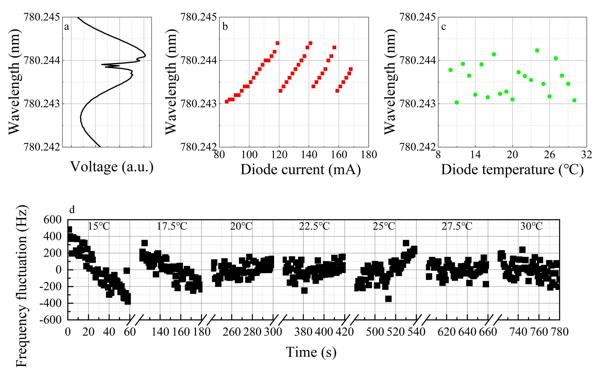 Fig. 3 (a) Saturation absorption spectrum of 85Rb atoms. (b) Variation in the output wavelength of the Voigt laser under changes in laser diode current. (c) Variation in the output wavelength of the Voigt laser under changes in laser diode temperature. (d) Temperature stress test: The laser diode temperature is increased by 2.5°C every 120 s, with the first 60 s allocated for temperature ramping and the subsequent 60 s for automatic relocking and stable operation of the Voigt optical frequency standard.