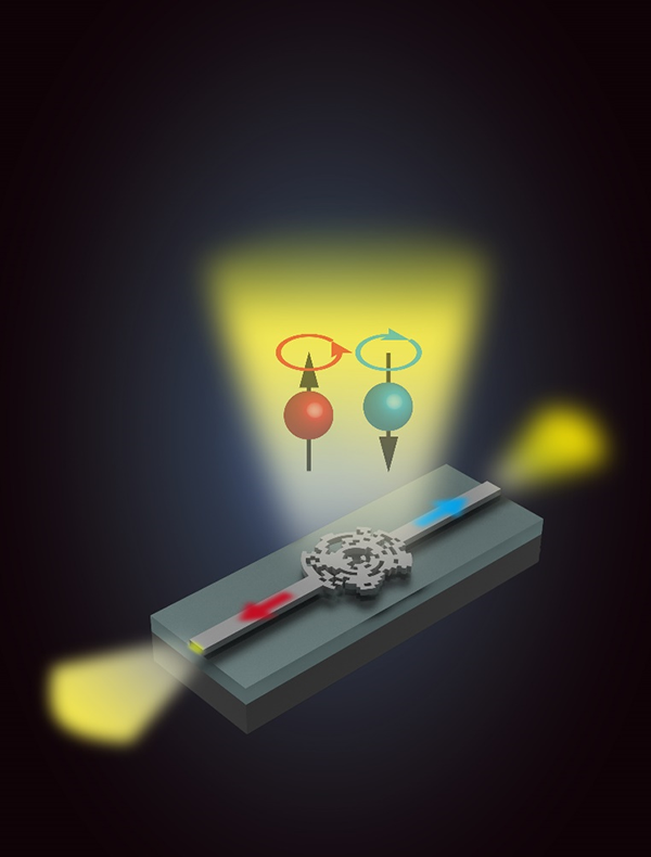 The device separates light with different spins, the left-handed component is coupled into the left waveguide, and the right-handed component is coupled into the right waveguide.