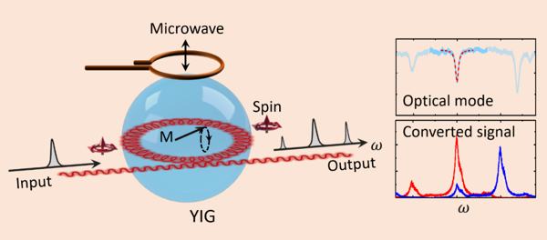Fig.1 Single sideband microwave-to-optical frequency conversion in a YIG microsphere.