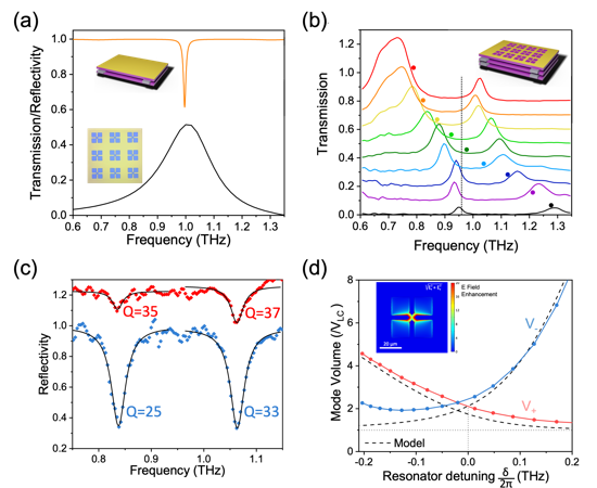 Fig. 1 (a), Reflection and transmission spectra of the Tamm cavity (orange) and LC metamaterial (black). (b) Transmission spectra of the Tamm cavity-LC metamaterial coupled resonators. The quality factor Q (c) and the Mode Volume (d) of the Tamm cavity-LC metamaterial coupled resonators.