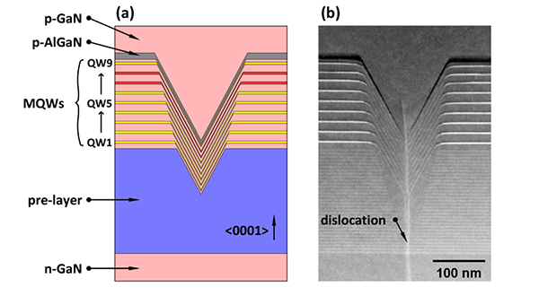 Schematic diagram of the epi-structure (a) and cross-sectional TEM test results (b) of efficient orange LED