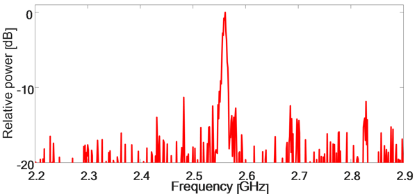 Figure 1 Measured normalized power transfer of signals through a surface acoustic wave-photonic device, as a function of their microwave frequency. Only a single narrow range of frequencies centered at 2.55 GHz is transmitted to the device output.