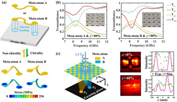 In recent years, 3D-buckling mechanical deformation strategy has been constantly investigated to play roles in the field of flexible electronics, biology, medical science, etc. In this method, the planar structures and their array patterns can be transformed into 3D states, which can be controlled by the flexible substrate. To investigate the applications of this method in the metamaterials can provide novel ideas for reconfiguring the metamaterials and modulating their responses. A research group led by Prof. Liuyang Zhang from Xi'an Jiaotong University proposed a dynamic modulation method of electromagnetic metamaterials based on 3D-buckling deformation principle. By this method, the in-plane asymmetric units are deformed in three dimensions to break the out-of-plane symmetries to enhance the chiral responses of metamaterials. Furtherly, the transmittance difference of the opposite enantiomer structures is adopted to design a double-foci flexible metalens with tunable focusing length and focusing intensity. This work introduces a 3D mechanical deformation method into the dynamic modulation of metamaterials. The relevant research results were published in Photonics Research, Volume 11, No. 10, 2023 (Donghai Han, Wenkang Li, Tao Sun, Min Liu, Xiaoming Chen, Hongyu Shi, Zhengjie Fan, Fanqi Meng, Liuyang Zhang, Xuefeng Chen. 2D-to-3D buckling transformability enabled reconfigurable metamaterials for tunable chirality and focusing effect[J]. Photonics Research, 2023, 11(10): 1770).