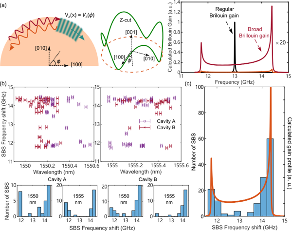As shown in Figure 1(a), due to the propagation of light waves at the curved surface of the whispering-gallery resonator, the acoustic waves interacting with them depend on the angle between the position and the crystal axis. Thus, when the light wave travels around one round, the acoustic velocity undergoes periodic changes, and theoretical calculations show that the stimulated Brillouin scattering gain envelope produced by one round of Z-cut magnesium fluoride whispering-gallery resonators is nearly 100 times wider than the traditional crystal envelope. Figure 1(b) shows the experimental measurement results in two Z-cut resonators with rich optical whispering-gallery modes, with the observed wide-range stimulated Brillouin scattering frequency shift covering from 11.73 GHz to 14.47 GHz. As shown in Figure 1(c), the Brillouin frequency shifts with sufficient data reflect the theoretical gain envelope.