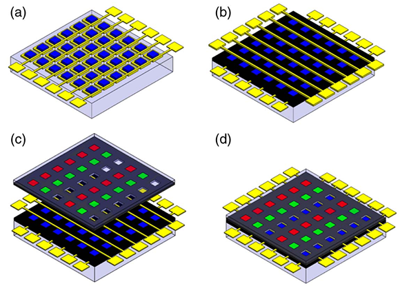 Figure 1. (a) Fabrication of micro-LED array on semipolar GaN epitaxial wafer, (b) deposit black matrix to flatten the micro-LED array, (c) use standard photolithography process to prepare QDPR color-conversion layer, (d) assemble the micro-LED array and the color-conversion layer.
