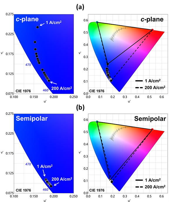 Figure 2. Color gamut under various current densities for (a) c-plane and (b) semipolar μ-LED.