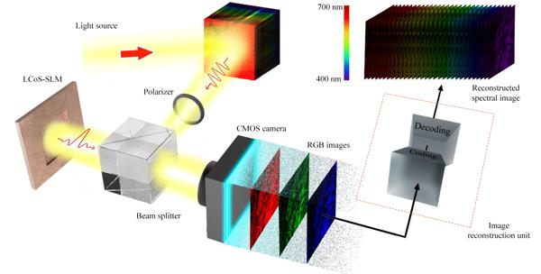 Although LCoS-SLMs have found widespread use in areas such as super-resolution imaging, light-field imaging, and computational holography, their potential in snapshot spectral imaging remains underexplored. To address the challenges of manufacturing precision and reduced diffraction efficiency in traditional DOEs, we propose a dynamic phase modulation scheme using LCoS-SLMs for efficient snapshot spectral imaging. This approach takes advantage of the high quantization accuracy (up to 256 levels) and real-time programmability of LCoS-SLMs to replicate the phase modulation function of DOEs. By applying optimized wavelength-specific phase patterns, we enhance spectral separation and improve reconstruction accuracy. With its high diffraction efficiency and dynamic adjustability, the developed imaging system achieves high-precision spectral reconstruction across the entire visible spectrum (400-700 nm). In comparison to traditional DOE systems, the peak signal-to-noise ratio (PSNR) of the reconstruction improves by 4.3 dB, and the structural similarity index (SSIM) rises to 0.98. Furthermore, the system supports flexible adjustments of focal length and field of view without the need for additional optical components, effectively reducing system complexity and cost. Relevant research results were recently published in Photonics Research, Volume 13, Issue 2, 2025. [Chong Zhang, Xianglei Liu, Lizhi Wang, Shining Ma, Yuanjin Zheng, Yue Liu, Hua Huang, Yongtian Wang, Weitao Song, "Lensless efficient snapshot hyperspectral imaging using dynamic phase modulation," Photonics Res. 13, 511 (2025)]