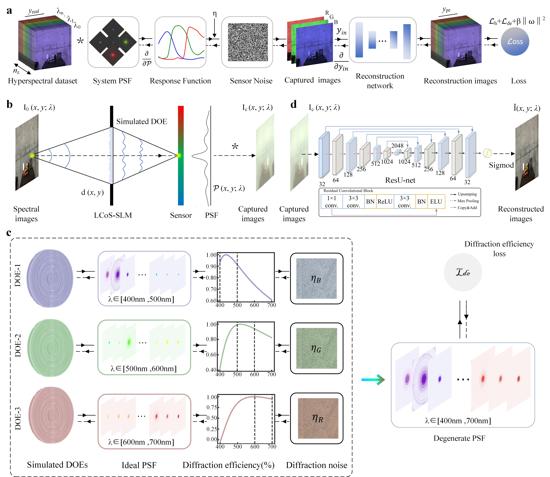 Figure 2b illustrates the process of acquiring the point spread function (PSF) for diffraction optical imaging based on DOE patterns using LCoS-SLM. The Distributed Diffractive Optics (DDO) model employs spatiotemporal multiplexing techniques by sequentially loading multiple DOE patterns, enabling distributed imaging of the same scene across different spectral bands. In this system, multiple simulated DOE patterns are loaded onto the LCoS-SLM to achieve the DDO model in batches. As shown in Fig. 2c, three simulated DOE patterns capture the scene in the 400-500 nm, 500-600 nm, and 600-700 nm spectral ranges. Figure 2d presents the structure of the reconstruction network, ResU-Net, used for image reconstruction.