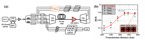 Then, the group construct a recirculating three-mode loop system, to verify the practicality of the 3M-EDFA, which can effectively compensate the 64-km fiber link loss at very low cost (Fig. 2a). A frequency-domain equalization is used to recover the data. Moreover, a cyclic mode permutation scheme is applied to suppressed DMD-induced pulse spreading, which effectively reduces the algorithm complexity. A 28-Gbaud QPSK transmission over 3840-km FMF are demonstrated. After 3840-km transmission, the average BER is below the forward error correction limit (Fig 2b).