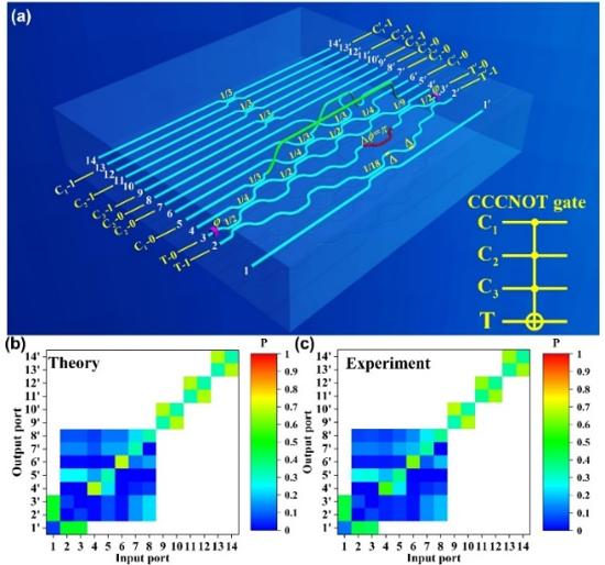 Fig.2 The circuit and experimental results of the path encoded four-qubit photonic quantum CCCNOT gate fabricated by the FLDW technique. (a) The optimized 3D quantum circuit of the CCCNOT gate with two overpass waveguides. (b) Theoretical output power distribution for each single port input. (c) Experimental output power distribution. The similarity of the experimental and theoretical values is 99.2%.