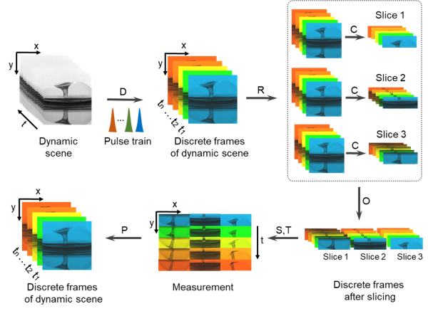 This study proposes a novel approach that integrates discrete pulse train illumination with spatiotemporal shearing imaging. The experimental setup is illustrated in Fig. 1. The STS-UFP system utilizes a pulse train generation device based on spectrum shuttle to produce illumination pulses. This device allows for flexible control over the number and temporal spacing of sub-pulses, enabling adjustments to the imaging sequence depth and time window for discrete sampling of ultrafast dynamic scenes. Furthermore, the sub-pulses within the pulse train have ultrashort durations, facilitating precise temporal slicing of dynamic scenes and mitigating motion blur caused by spatiotemporal aliasing. A streak camera captures the dynamic scene through spatiotemporal shearing, redistributing images from different temporal moments to distinct spatial positions. To balance the trade-off between field of view (FoV) and imaging sequence depth in the STS-UFP system, a spatial slicing module is introduced. This module duplicates the dynamic scene and redistributes it horizontally while introducing a vertical offset. After passing through the entrance slit of the streak camera, the recorded region is transformed into three horizontally arranged slices. This approach effectively optimizes the balance between imaging sequence depth and FoV height, enhancing the overall imaging performance of the system. The time window of the STS-UFP system can be flexibly adjusted by modifying the pulse train interval and the slope of the streak camera's scanning voltage, accommodating different temporal detection requirements. Finally, image processing algorithms are employed to reconstruct a discrete sequence of dynamic scene images. To improve image quality, Laplacian blending is applied to minimize intensity mismatches at stitching locations, while a DRU-Net-based denoising algorithm is incorporated to effectively suppress noise, thereby optimizing imaging performance. The data processing workflow is depicted in Fig. 2.