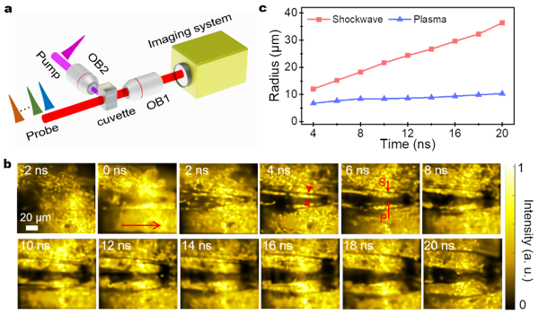 Figure 3. (a) Experimental setup for observing femtosecond laser-induced plasma and shock wave expansion in water using STS-UFP. (b) Processed image of plasma and shock wave expansion induced by a 400 nm femtosecond laser pulse in water. (c) Expansion curve of plasma and shock wave.