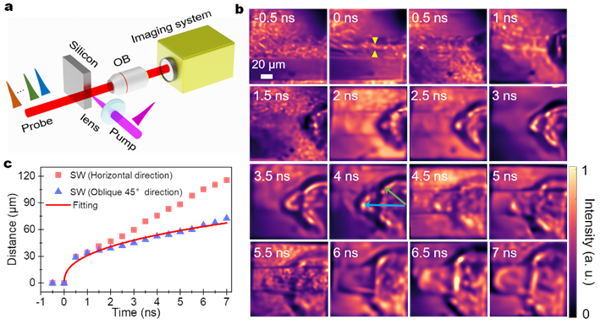 Figure 4. (a) Schematic diagram of the experimental setup for observing femtosecond laser-induced shock waves on a silicon surface using STS-UFP. (b) Processed image of the femtosecond laser-induced shock wave. (c) The propagation distances of the shock wave in the horizontal and diagonal 45° directions were extracted and analyzed. Additionally, the propagation distance in the diagonal 45° direction was fitted using the Sedov-Taylor theory.