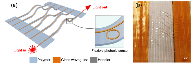 The fabrication approach for 3D integrated photonics offers a number of key advantages. First, it leverages standard planar processing technologies used in the fabrication of traditional integrated photonics, thus allowing for high-quality optical components. This also ensures compatibility with most materials commonly used in integrated photonics, which can be either directly deposited and processed on a polymer substrate, or transferred onto the substrate. Second, this approach enables construction of 3D architectures by controlled, deterministic mechanical deformation, as outlined in the previous paragraph. Third, it is readily scalable to a large number of sensing channels. Additional probing points can be created simply by increasing the number of lithographically defined strips and by multiplexing several optical sensors along each waveguide, without compromising the quality and throughput of fabrication. Finally, as this platform is based on standard optical components, it allows for compatibility with common optical coupling and packaging schemes, such that devices can be readily used outside optical laboratories.