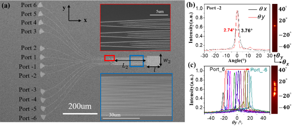 Fig.2. (a) Scanning electron microscopy (SEM) images of the lithium niobate POPA with 12 ports. (b) Measured FWHM beam size of far-field intensity pattern of the POPA. (c) Measured beam scanning angles ranging from -21.27° to 21.27° by switching input ports.