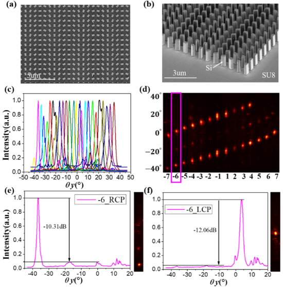 Fig. 3 The POPA integrated with metasurface. (a, b) The top and side view SEMs images of the integrated Si metasurface above the radiation grating. (c) The far-field radiation results by switching the input port, achieving a ±41.04°scanning range. (d) Measured beam profiles of the far-field experimentally. (e, f)Measured far-field emission pattern of right-circular polarized light and left-circular polarized light with No-6 input as described in (d).
