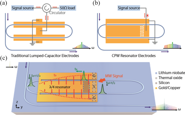 Figure 1. Working principles of microwave resonator-enabled broadband EOFC generation. (a) Comparison between lumped capacitor and (b) microwave resonator schemes. (c) Schematic of electric field distribution and phase-matching conditions in the microwave resonator-based comb generator.