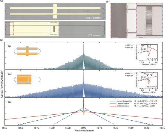 Figure 2. (a) Micrograph of a traditional lumped-capacitor design and (b) the proposed coplanar microwave resonator-based EOFC generator. (b) SEM images of the microwave resonator's shorted end and coupling capacitor. (c) Comparison of comb spectra under 740 mW driving power: (i) lumped capacitor and (ii) microwave resonator designs. (iii) Numerical simulations of experimental results (i, ii) with potential higher optical Q and input power.