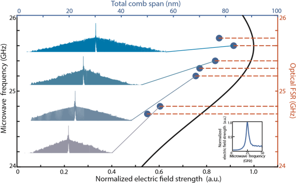 Figure 3. EOFC generation under frequency detuning. Black curves show the normalized electric field of the microwave resonator (left axis, bottom scale); blue dots represent measured comb spectra (right axis, top scale).