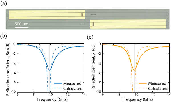 Figure 4. Microwave resonators for different target frequencies. (a) Micrograph of 10 GHz microwave resonators. Measured resonance frequencies: (b) 9.82 GHz and (c) 9.67 GHz.