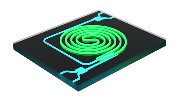 Schematic of optical waveguide amplifier die via monolithic double-layer integration platform. The cyan part indicates Si3N4 platform and the green part indicates the rare-earth-ion doped gain medium.