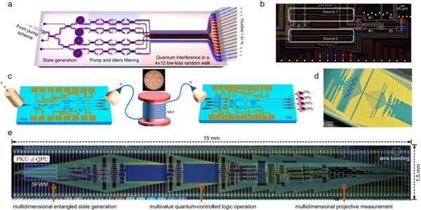 Fig. 2 Multiphoton and high-dimensional applications with silicon photonic devices. (a) Silicon photonic chip for the generation and sampling of quantum states. (b) Coherent pumping of two sources and processing of the emitted photons. (c) Chip-to-chip high-dimensional quantum key distribution based on multicore fiber. (d) Silicon device for multidimensional quantum entanglement. (e) Programmable qudit-based quantum processor.