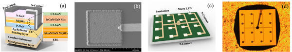 The schematic of the vertical structure of the Si-substrate micro-LED is shown in Fig. 1(a). Three chip sizes of 10 μm × 10 μm, 50 μm × 50 μm and 100 μm×100 μm are designed simultaneously in the experiment. The scanning electron micro-scope (SEM) images of 50 μm × 50 μm is demonstrated in Fig. 1(b). On the basis of the above micro-LED chips, 4×4 LED arrays are manufactured as shown in Fig. 1(c). Figures 1(d) shows the optical microscope images of 50 μm micro-LED arrays.