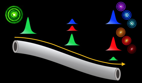 Schematic of intermodal four-wave mixing: The intense pump pulse (green), guided in a superposition of the LP0,4 and LP0,5 modes (mode image inset), is converted to broadband anti-Stokes (blue) and Stokes (red) pulses along the length of the optical fiber.