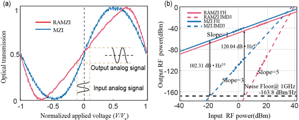 Fig. 2. (a) Measured optical transmissions of the RAMZI modulator (red) and a reference MZI modulator (blue). (b) Measured SFDR results for the RAMZI (red) and the reference MZI (blue).