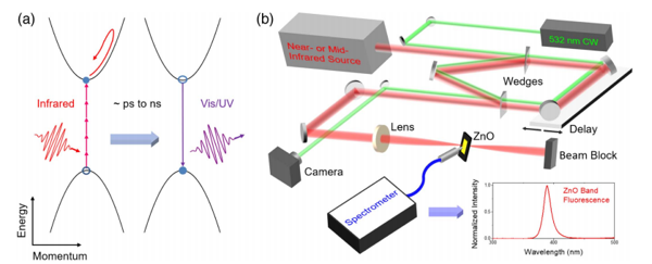 Fig. 1 (a) Schematic of strong-field excitation and relaxation via band fluorescence emission in solids. (b) Experimental setup for solid-state TIPTOE using band fluorescence in ZnO.