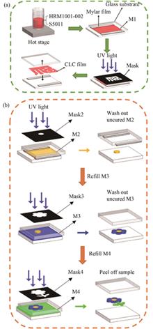 Cholesteric liquid crystals (CLCs), one-dimensional chiral soft photonic crystals, have a wide application in fields such as security tags, nanolasers, and sensing. In this paper, a multi-step UV patterning curing method combined with a washout-refill process was used to realize multi-color free-standing flexible CLC film reflectors. A label printer is used to print PET patterned mask, and a polymerizable CLC material is UV cured to obtain the free-standing flexible patterned CLC film reflector. Based on this, the uncured material was washed-out, refilled with CLC of different chiral dopant content, and the patterned UV light was re-exposed to realize a multi-color flexible free-standing CLC reflector. The effects of different incidence angles, bending radius of curvature and temperature on the optical properties of the reflector are investigated. The experimental results show that the multi-color free-standing reflectors prepared by the above method have good flexibility, the Bragg reflection center wavelength is basically constant at different radii of curvature, and it is red-shifted with the increasing temperature, which has good linearity. This proposed multi-color free-standing flexible film reflector protocol can further expand CLC’s applications in the fields of display, sensing, laser protection and micro-nano optics.