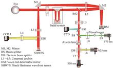 Adaptive optics is widely used to correct aberrations in the human eye, achieving high-resolution imaging of fundus cells and microvessels. Traditional adaptive optics systems are limited by the dynamic range of the Shack Hartmann wavefront detector and are only suitable for some people, and cannot perform fundus high-resolution imaging in people with high refractive errors. In order to improve the universality of fundus adaptive optical imaging system, this paper designs a high-resolution fundus adaptive optical imaging system based on voice coil deformation mirror. The introduction of the Badal focusing system can perform high-resolution imaging of the fundus with the diopter of the human eye between -8~8 D. In this system, the traditional annular diaphragm is replaced with an adjustable axial cone lens set, the spacing of positive and negative axonal cone lenses are controlled to adjust the inner diameter of annular light in order to adapt the cornea of different eyes, and avoid stray light reflected by the cornea. Large field of view imaging is realized through visual beacon guidance. The simulation results show that the illumination subsystem has a uniform distribution of retinal illumination in the fundus. Within the set tolerance, at least 90% of the MTF values reach 0.21 at 25 lp/mm (corresponding to 4 μm on the retina). The corresponding optical path was built in the laboratory, and the simulated human eye with large distortion was imaged, and a good imaging effect was obtained.