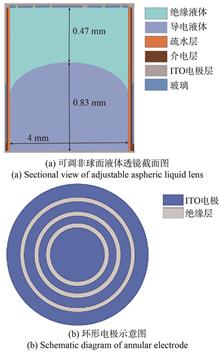 A kind of adjustable even aspheric liquid lens combined with electric wetting effect and electrostatic force is proposed. The aspheric liquid lens is simulated by using Comsol Multiphysics software. The electrostatic force generated by four circular electrodes can flexibly adjust the surface shape of the liquid lens. The zoom optical system is designed by using the liquid lens. The aspheric equation for optimizing and correcting the aberration is obtained by using the Zemax software. As the target surface of the adjustable even aspheric liquid lens, the voltage on the electrowetting electrode and the four-ring electrode is adjusted. The simulated root mean square error of the optical path between the aspheric surface and the target aspheric surface is less than λ/14, which meets the Marechal criterion. In the range of 26~30 mm focal length, compared with the aspheric liquid lens system with the ring electrode voltage of 0 V, the adjustable even aspheric liquid lens zoom system with the ring electrode voltage has good imaging effect.