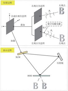 Holographic optical element (HOE) is one of the important devices for holographic 3D display. In order to solve the problem of parallax mismatch when HOE is used for binocular holographic display, this paper proposes and implements a holographic display binocular parallax construction method based on HOE. At the same time, the aberrations of the components are analyzed and corrected. By analyzing the production principle and imaging rule of HOE, combining the virtual model rendered by ray tracing technology and the real scene model, a holographic binocular display system based on HOE is designed, and a binocular parallax construction method is proposed, that is, a real-time view image containing binocular parallax relationship is provided for the observer when acquiring the coordinate position of the human eye. By further analyzing the cause and process of image distortion in holographic display system, an optimization algorithm to remove the distortion is proposed. Experiment results show that the proposed method can not only realize the HOE display holographic 3D image in real time, but also solve the problem of parallax mismatch and image distortion in the holographic binocular display of HOE.