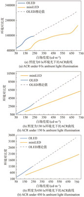 In order to explore the visual contrast effect of OLED and Mini LED display under different ambient light intensity, the parameters are measured and verified from the perspective of environmental contrast and human eye perception. We analyze the contrast performance of two display technologies in darkroom, 100 lx ambient light and 450 lx ambient light. The test results are discussed by correating with the theoretical simulation calculation. The rationality of environmental contrast is analyzed from the perspective of human eye perception. Based on human factors experiment, the equal perception contrast is studied. The experimental results show that the environmental contrast is not consistent with the perceived contrast of human eyes. To describe the perceptual contrast, we should not only focus on the brightness ratio of black and white pictures, but also consider the brightness of black field and white field. In a dark room or an ambient light of 100 lx or 450 lx, the Mini LED can achieve a visual contrast effect similar to OLED by increasing the brightness of all-white field by 1~1.7 times.
